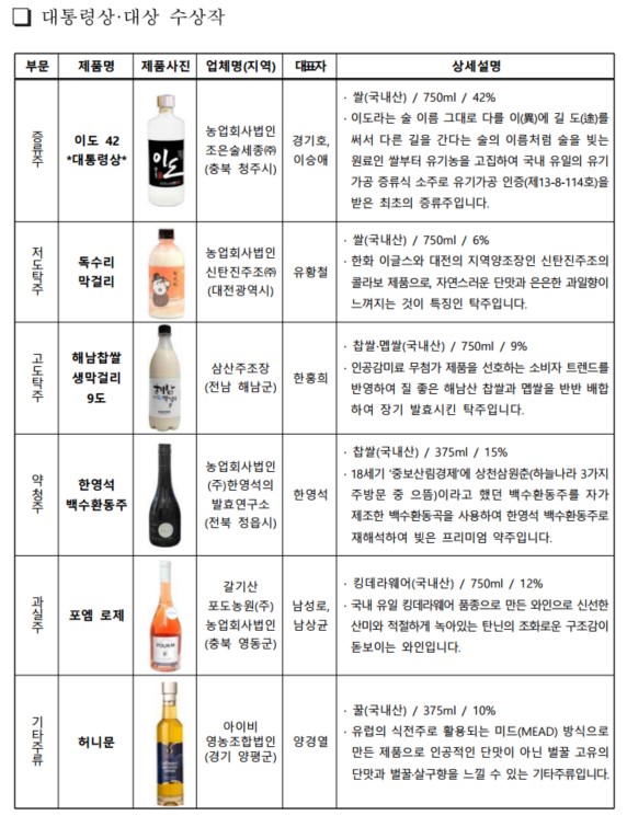 대통령상을 차지한 제품은 ‘이도42’입니다. 농업회사법인 조은술세종의 전통주로서, 충북 청주 지역에서 재배한 유기농 쌀을 원료로 제조한 증류주입니다. 이외에도 신탄진주조의 ‘독수리막걸리’(저도 탁주), 삼산주조장의 ‘해남찹쌀생막걸리9도’(고도 탁주), 한영석 발효연구소의 ‘한영석 백수환동주’(약청주), 갈기산포도농원의 ‘포엠로제’(과실주), 아이비영농조합의 ‘허니문’(기타주류)가 대상으로 선정되었습니다. 이들 제품에 대한 시상은 오는 11월 예정된 ‘2024 대한민국 우리술 대축제 기념 행사’와 연계해서 이루어지며, 수상 제품은 상금과 함께 바이어 초청 시음회, 보틀숍·주점 입점 지원, 온라인 홍보 등 다양한 판촉 혜택이 주어집니다.