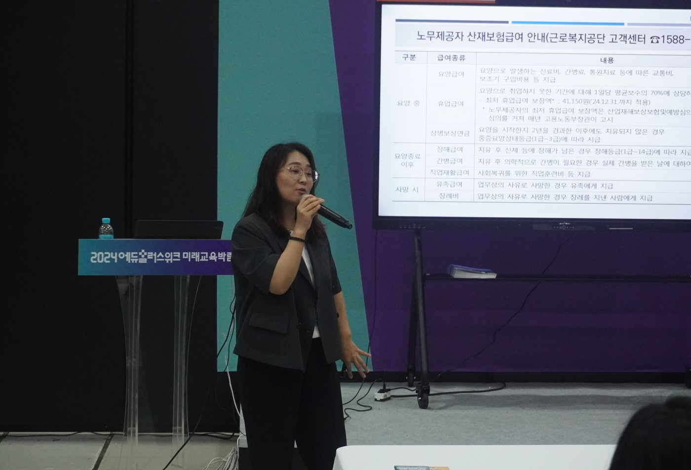 9일 근로복지공단 이윤미 팀장이 테크힐에서 '방과후학교 선생님을 위한 고용 및 산재보험 혜택 가이드'를 주제로 발표를 하고 있다. 사진=위즈경제