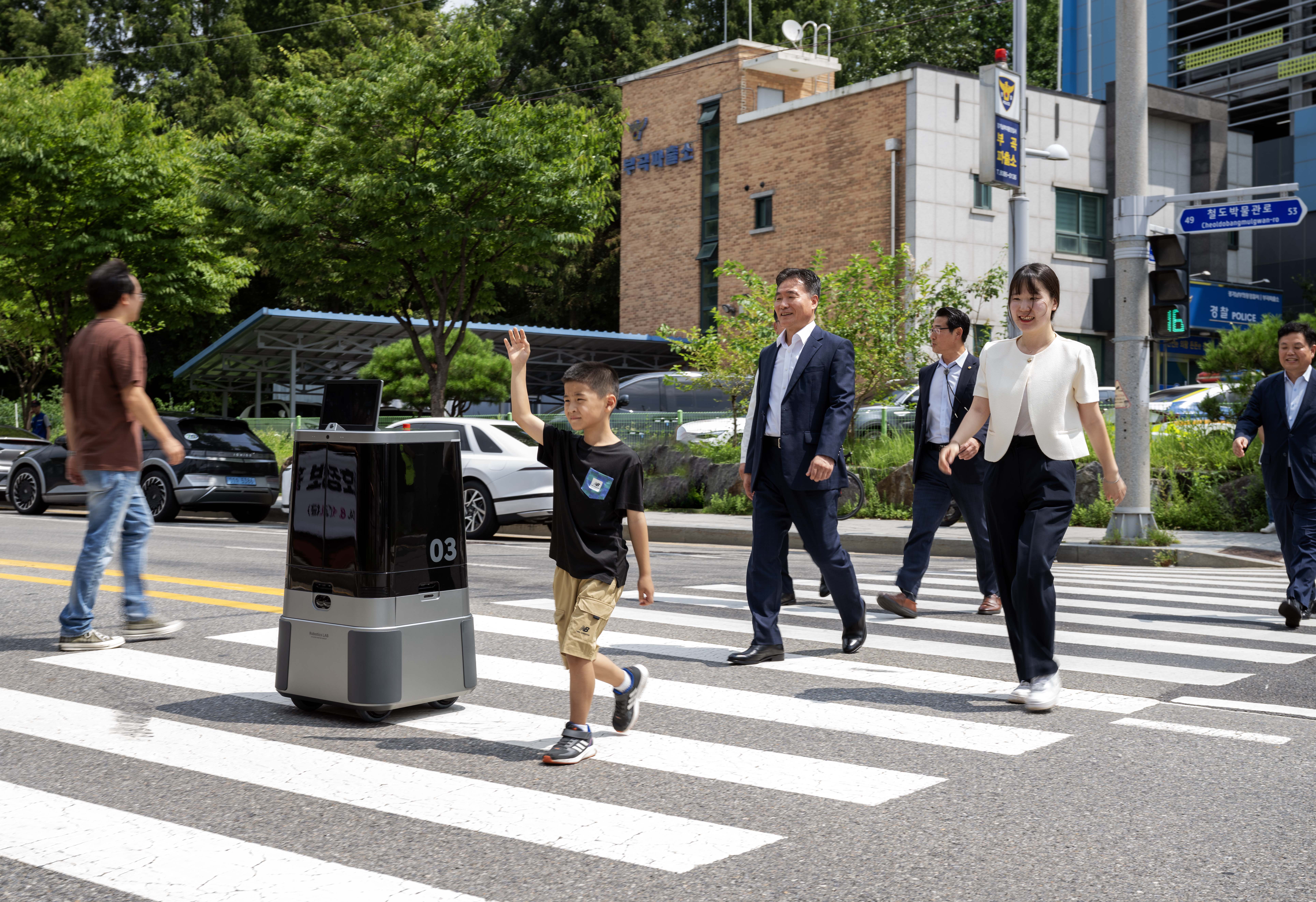 지난 9일 경기도 의왕시 부곡파출소 앞 횡단보도에서 경창철, 한국도로교통공단, 의왕시 관계자가 참여한 가운데 자율주행 배송로봇 달이 딜리버리(DAL-e Delivery)의