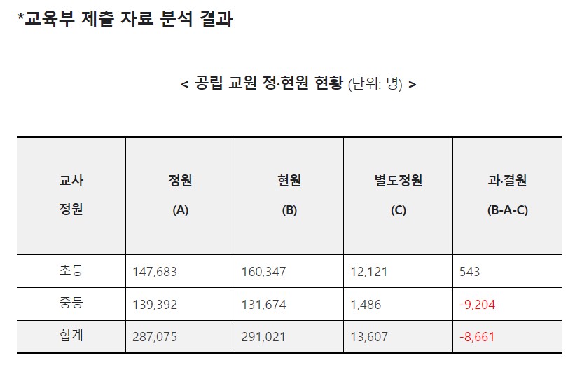 5일 교육부가 국회 교육위원회 소속 정을호 의원(더불어민주당)에게 국정감사 자료로 제출한 '공립 교원 정·현원 현황'에 따르면, 올해 초중등 과·결원이 8661명인 것으로 나타났다. 이 결과는 올해 3월말을 기준으로 공립 교원의 현재인원에서 법령으로 정해진 인원과 별도정원 수를 뺀 값이다. 결원 대부분은 중등교사로 고교학점제 도입에 따른 정원 대책 마련이 시급하다는 것이 정 의원 측 입장이다.