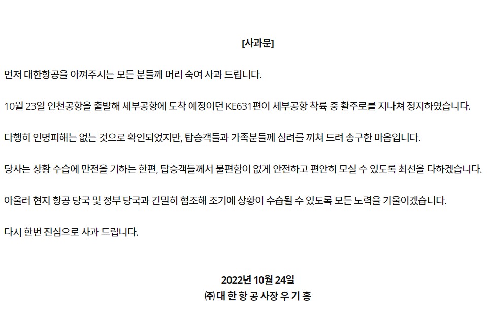 대한한공 관계자는 사고 당시 상황을 묻는 질문에 “여객기가 세부공항 기상악화에 따라 2차례 복행(Go-Around) 후 절차에 따라 착륙을 실시했다. 이 과정에서 착륙에는 성공했지만 활주로를 벗어나 동체가 파손되는 사고가 발생했다”고 밝혔습니다. 우기홍 대한항공 사장은 이날 사고에 대해 사과문을 발표했습니다.
