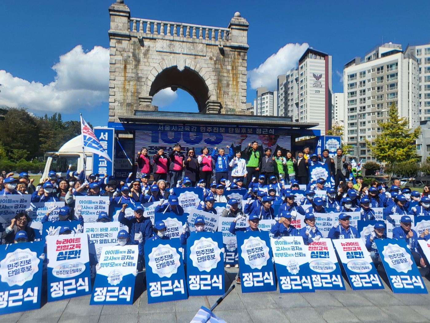 정근식 서울시교육감 후보 3일 오전 11시 독립문 공원 앞 출정식에서 한 팔을 번쩍 들어올리는 포즈를 취하고 있다. 사진=위즈경제