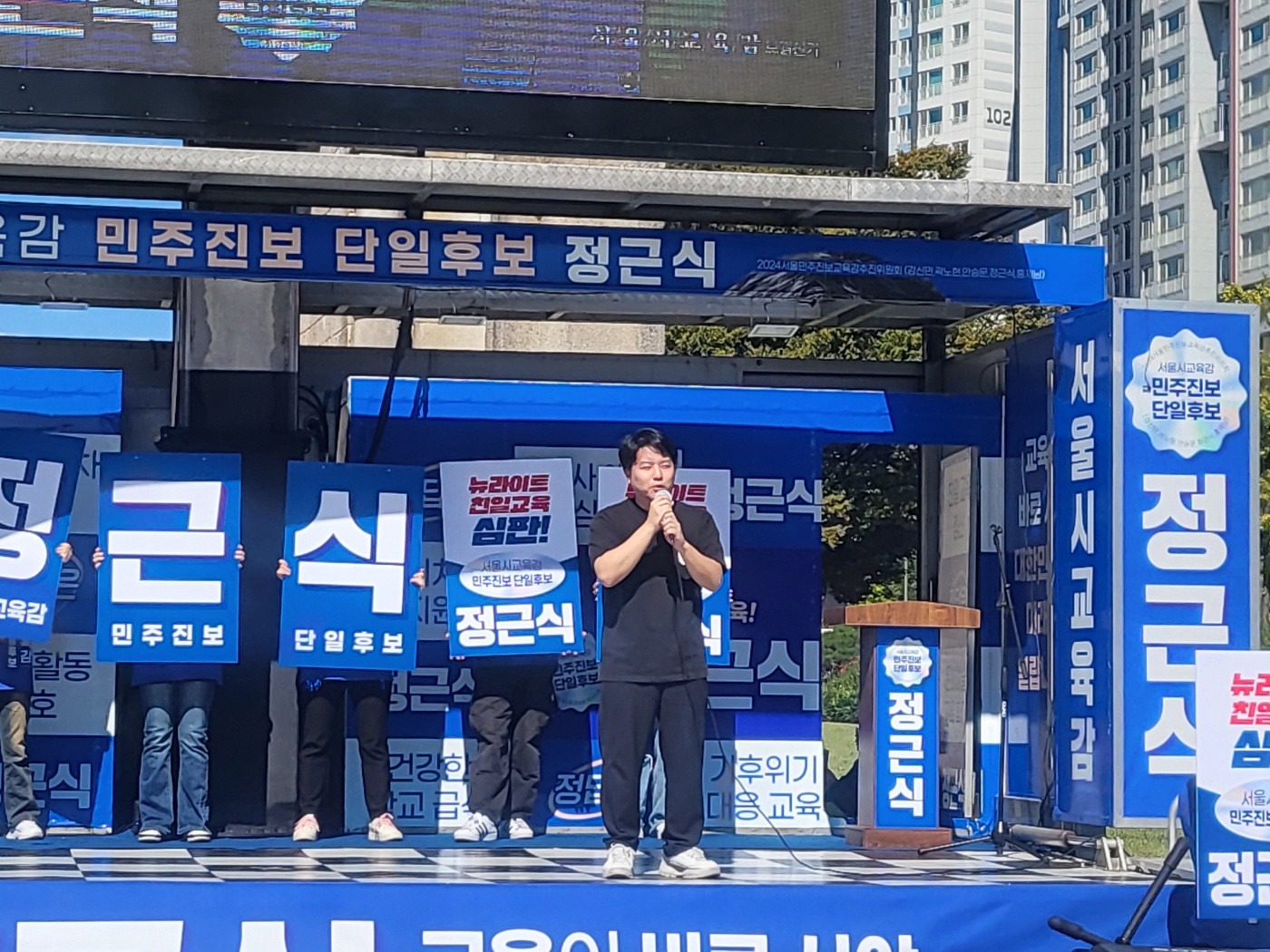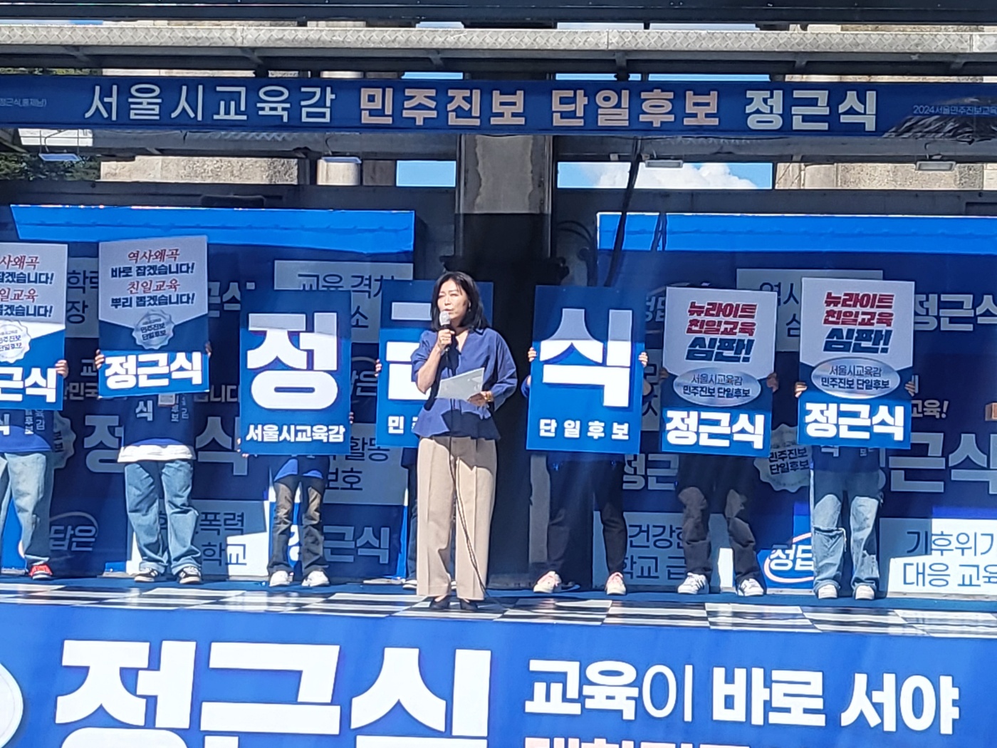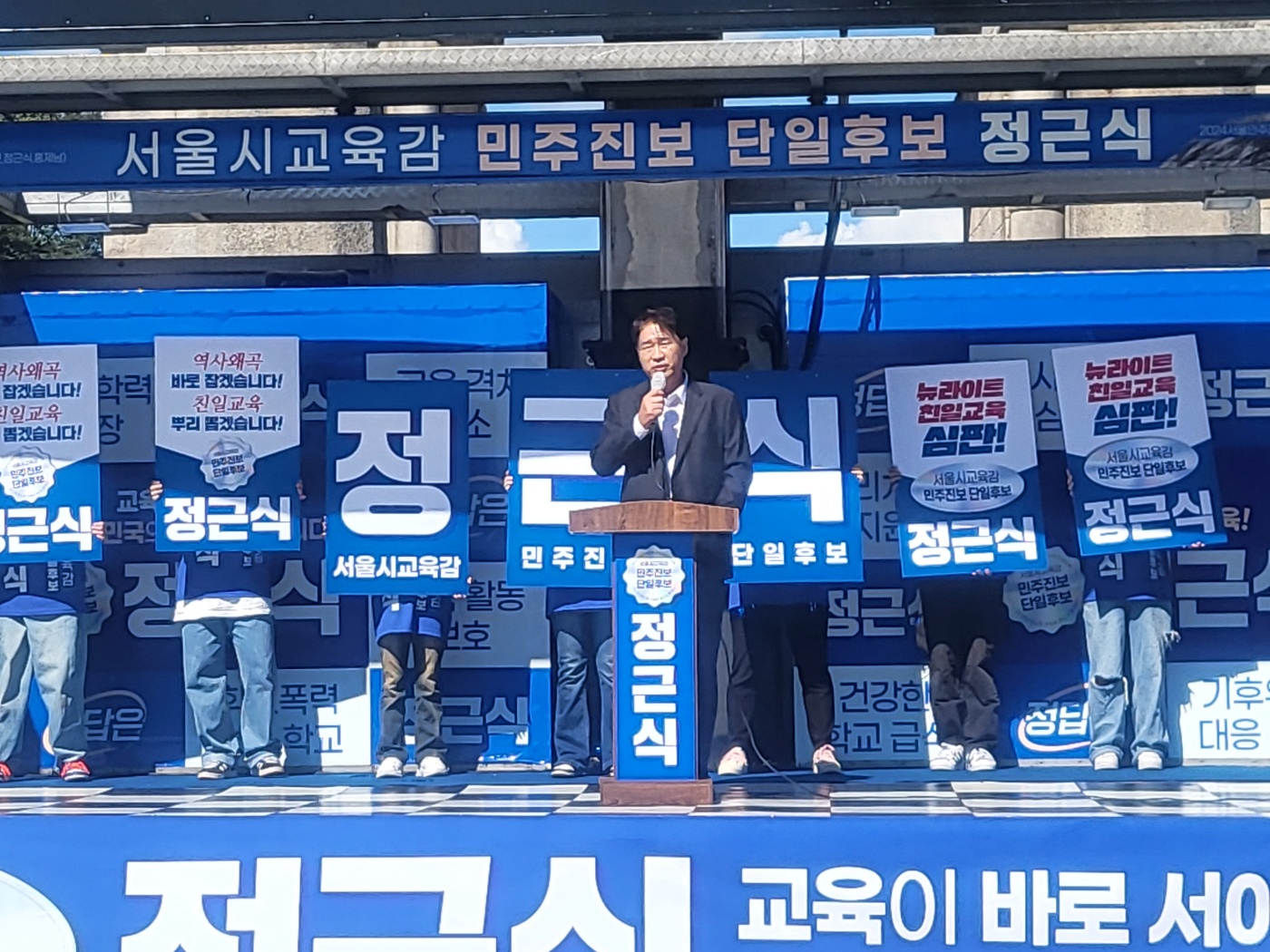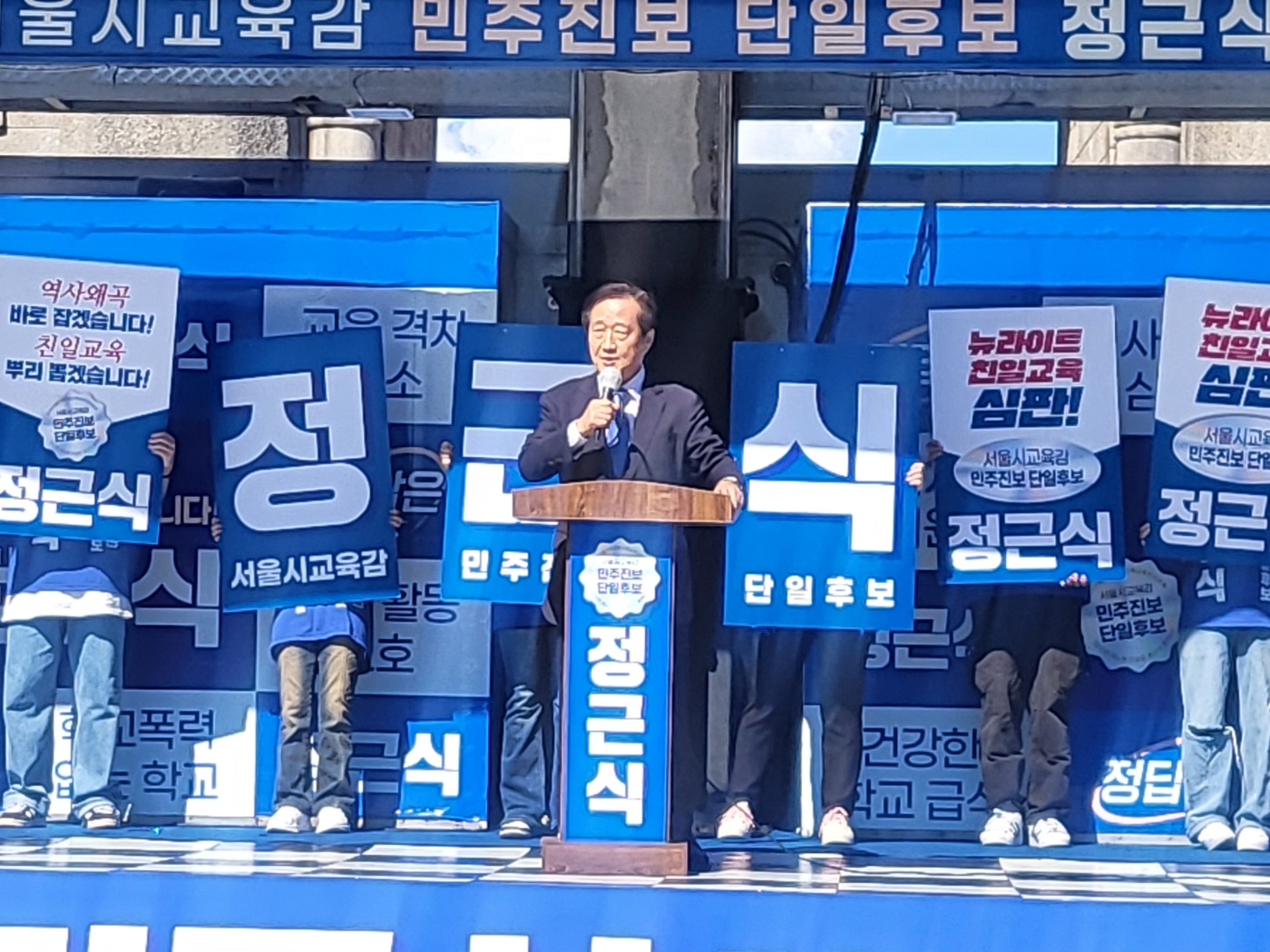 정근식 서울시교육감 진보진영 단일 후보가 3일 오전 서울 서대문구 독립문공원에서 열린 출정식에서 유권자들에게 지지를 호소하고 있다. 사진=정 후보 캠프