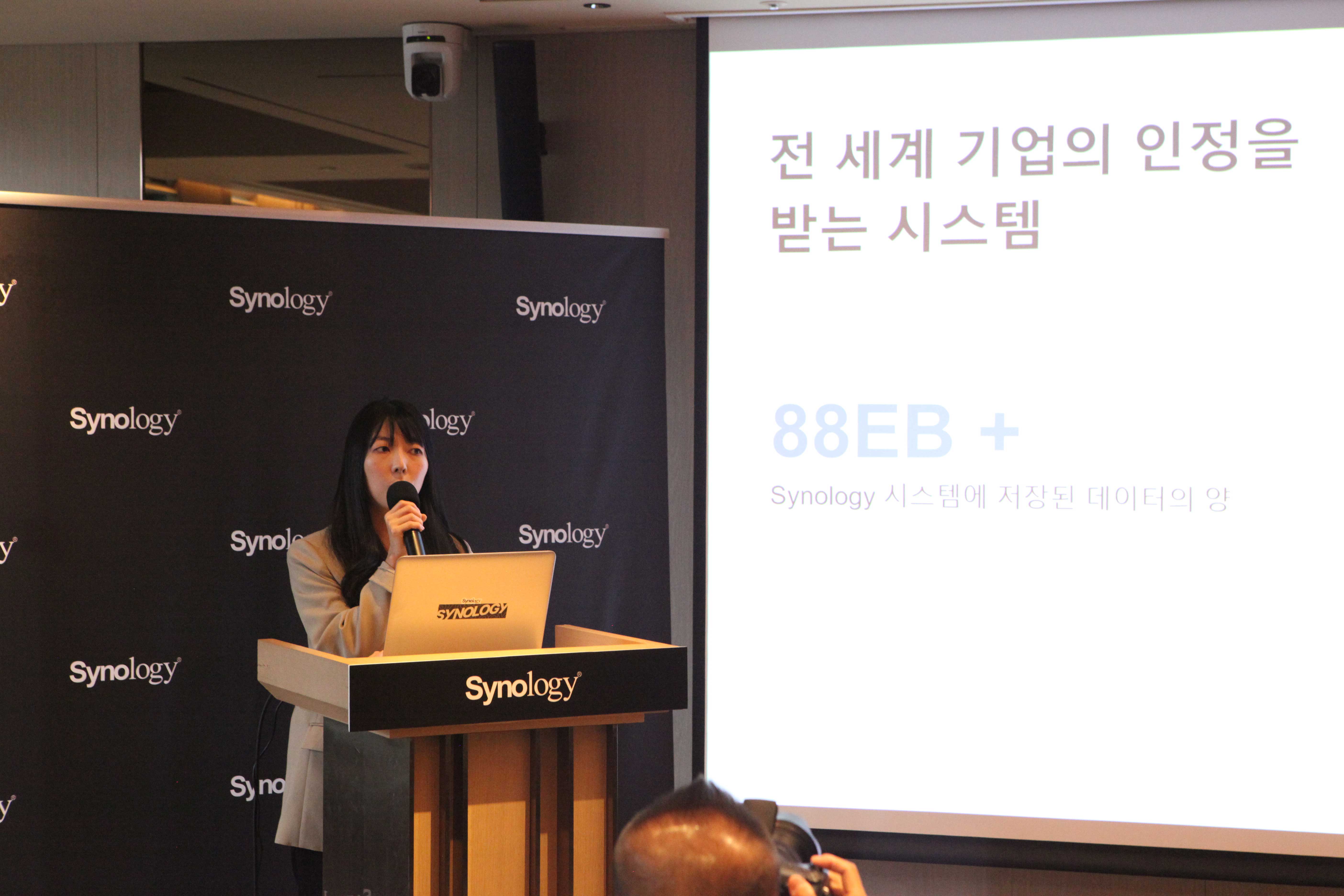 시놀로지, 기업용 올인원 백업 솔루션, 스케일 아웃 소토리지 솔루션 등 신제품 관련 설명을 진행 중인 석미은 시놀로지 시니어 세일즈 매니저(출처=위즈경제)