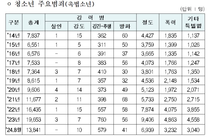 2014년에 비해 2023년 크게 늘어난 촉법소년은 절도와 폭력이 견인한 양상이다. 2014년 기준 절도와 폭력은 각각 4427명, 1835명이었으나 2023년에는 6939명,3232명으로 대폭 늘었다.