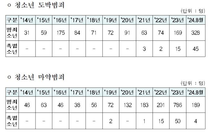 청소년 도박·마약 범죄에서도 촉법소년의 증가세는 두드러졌다. 2021년 도박범죄로 입건된 촉법소년은 3명이었다. 그러나 올해는 8월까지 벌써 45명으로 15배 폭증한 것으로 나타났다. 지난해 마약범죄로 입건된 촉법소년은 50명으로 2019년(2명)에 비해 25배가 늘었다.
