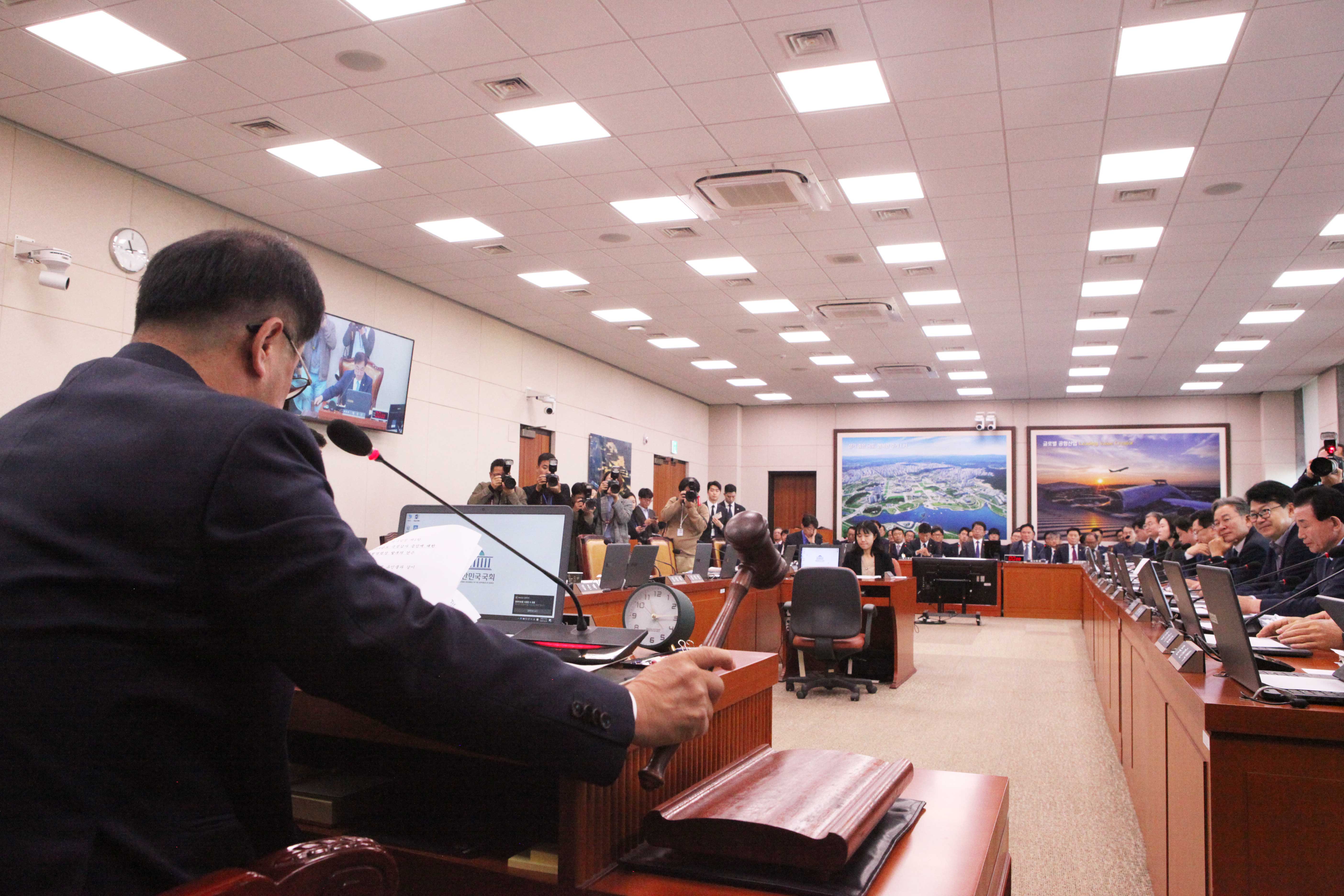 ‘대통령실 관저 증축’ 관련 증인 동행명령장 의결과 관련해 의사봉 두드리는 맹성규 국토교통위원회 위원장 (출처=위즈경제)