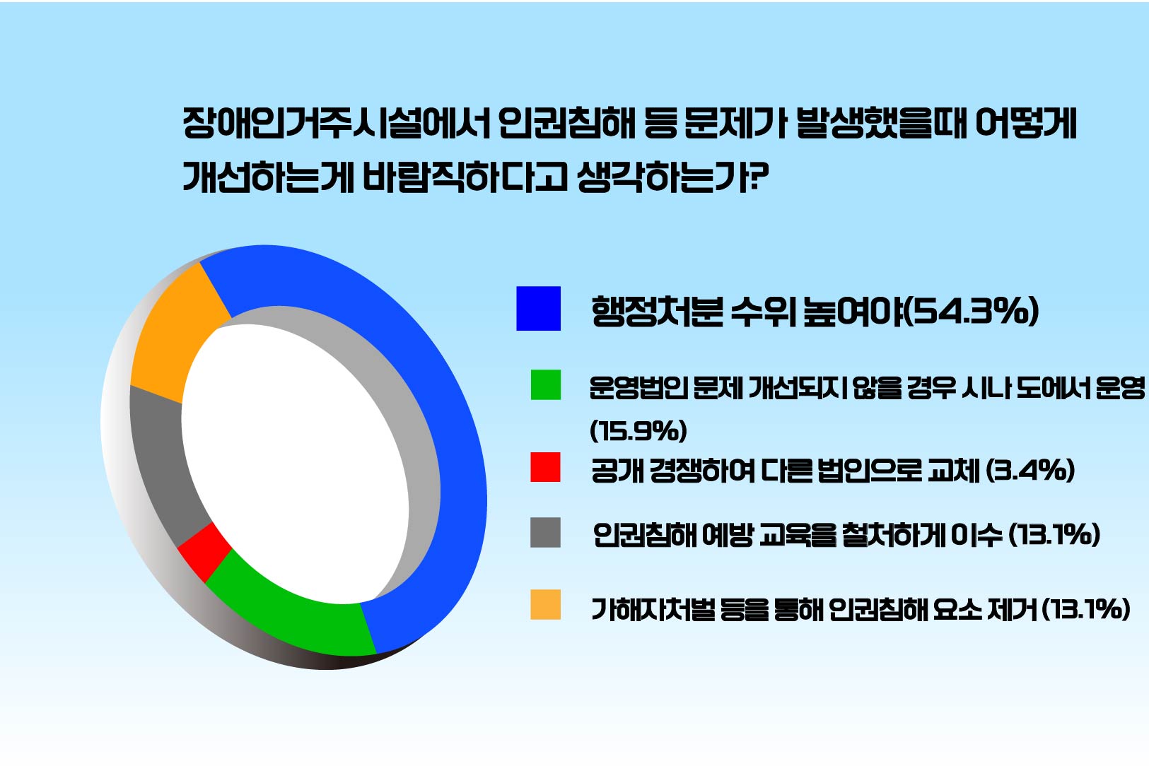 '장애인거주시설에서 인권침해 등 문제가 발생했을 때 어떻게 개선하는게 가장 바람직하다고 생각하는가'는 질문에는 '가해자처벌 등을 통해 인권침해 요소를 제거한다'는 의견이 절반 이상(54.3%)을 차지했다.