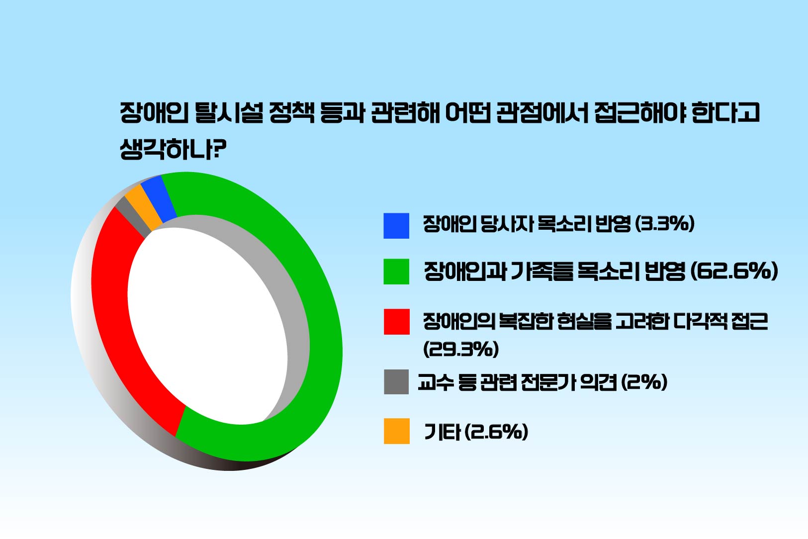'장애인 탈시설 정책 등과 관련해 어떤 관점에서 접근해야 한다고 생각하나'(복수응답)는 질문에는 '장애인과 가족들 목소리를 반영해야 한다'는 질문에는 62.6%가 '장애인과 가족들 목소리를 반영'해야 한다고 응답했다. 이어 '장애인의 복잡한 현실을 고려한 다각적 접근'(29.3%), 장애인 당사자 목소리 반영(3.3%), 교수 등 관련 전문가 의견(2%), 기타(2.6%) 순이다.