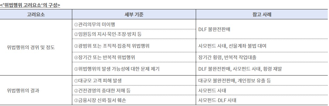 개정 지배구조법(제35조의2)은 횡령·부당대출 위법행위뿐 아니라 금융사고에도 임직원의 관리 책임을 묻는다. 또한 대규모 소비자 피해 발생 여부, 금융시장 질서의 심각한 훼손 여부 등 위법행위나 금융사고의 결과를 고려한다.