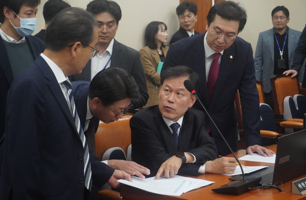윤한홍 국회 정무위원장과 여야 간사인 강민국 국민의힘 의원과 강준현 더불어민주당 의원, 수석전문위원이 12일 오후 서울 여의도 국회에서 열린 정무위원회 전체회의에서 대화하고 있다. 사진=위즈경제