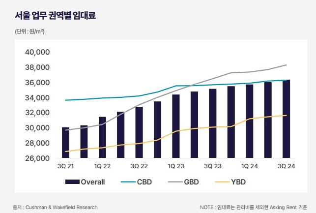 신규 공급에도 불구하고 오피스 임대료는 급격히 상승했다. (출처=쿠시먼앤드웨이크필드코리아)