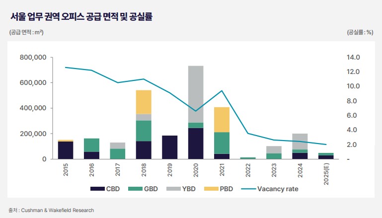 이는 최근 2년간 제한적으로 이뤄진 신규 공급의 영향이라는 설명이다. 2023년부터 2024년까지 권역별로 앵커원(여의도), TP타워(여의도), 메리츠화재 신사옥(중앙), 스케일타워(강남) 등이 신규 공급됐으나 수요를 충족하기에는 부족했던 것으로 분석된다.
