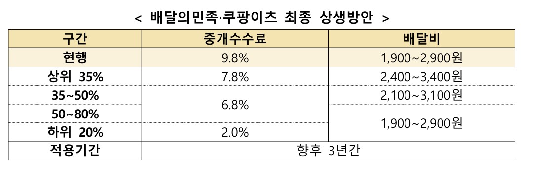 배달의민족과 쿠팡이츠는 상생방안 시행을 위한 시스템 정비를 거쳐, 내년 초에는 오늘 제시한 상생방안이 적용, 시행될 수 있도록 하겠다는 계획을 밝혔다.