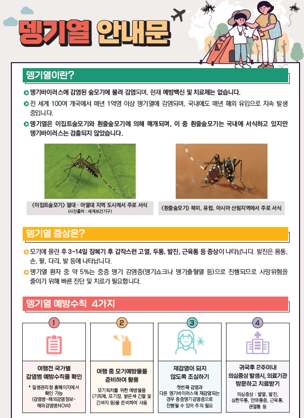 질병관리청은 해외 여행 시 모기기피 용품 및 상비약을 필수적으로 준비하는 건 물론, 귀국 후 2주 이내에 발열이나 근육통 등 의심증상을 겪으면 가까운 의료기관을 방문해야 한다고 당부했습니다.