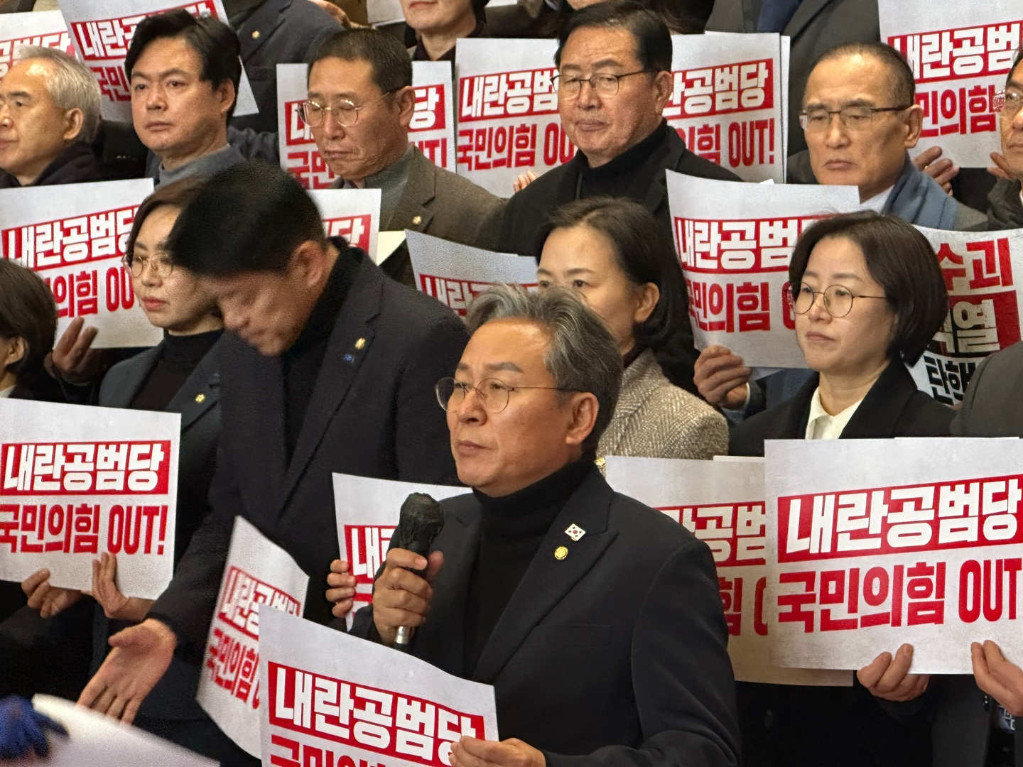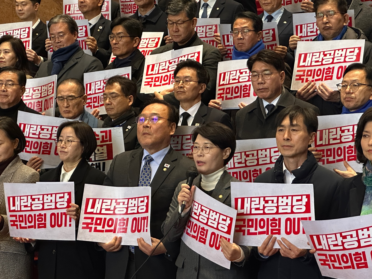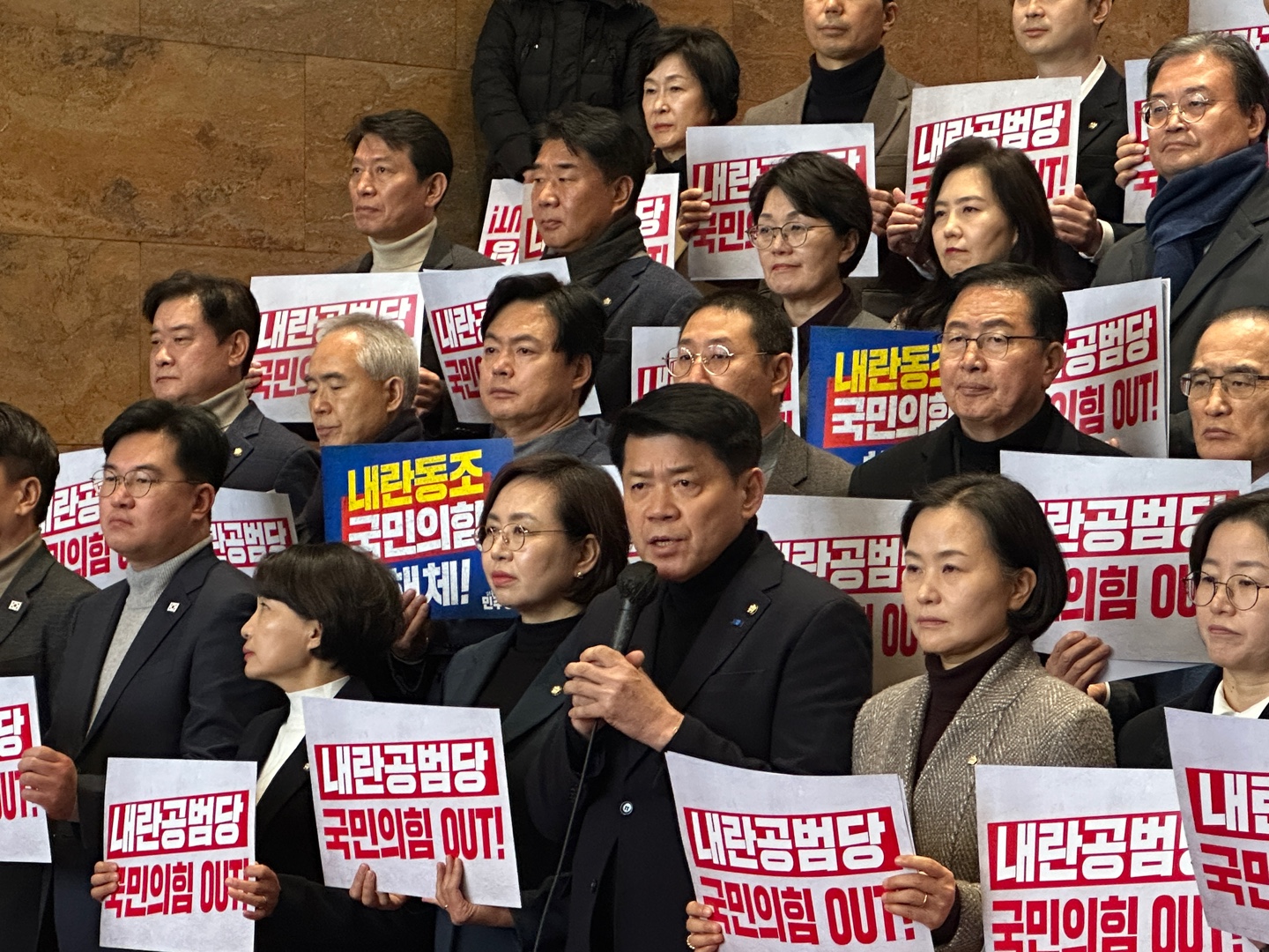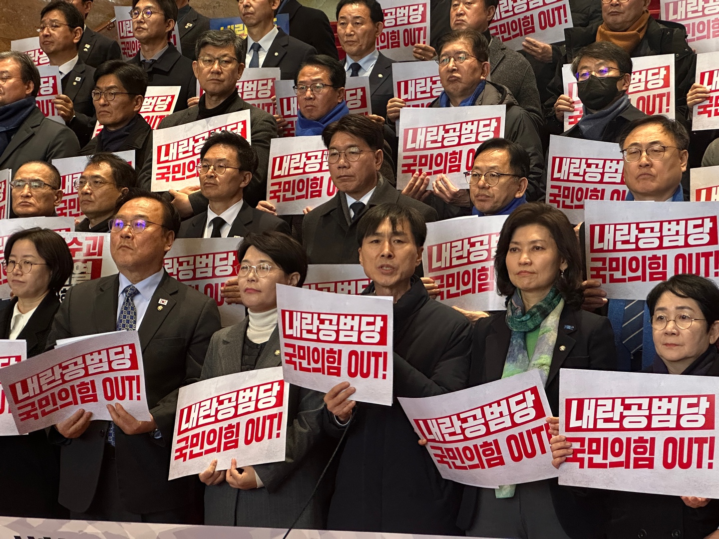 이날 기자회견에 참석한 의원들은 '내란동조 국민의힘 해체', '내란공범당 국민의힘 OUT' 등의 내용이 담긴 피켓을 들고 "내란 수괴 윤석열을 즉각 체포하라", "내란 비호 44명 즉각 사퇴하라", "국민의 짐, 헌법의 적 국민의힘 해체하라", "헌법파괴, 사법파괴, 국민의힘 해체하라" 등의 구호를 제창했다.