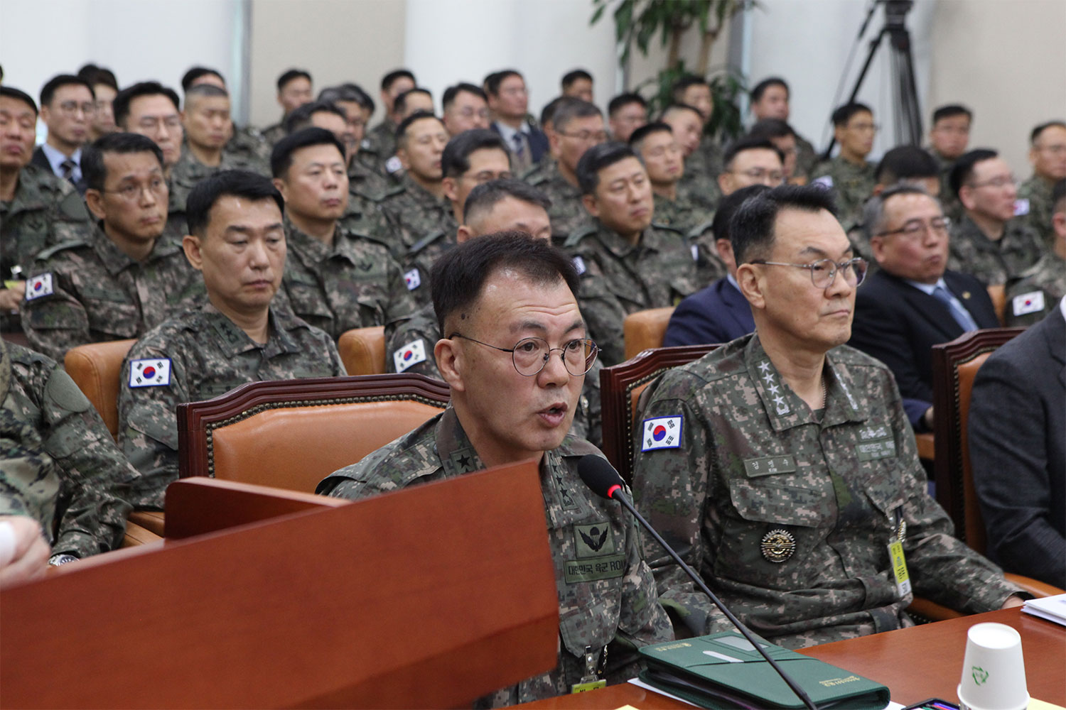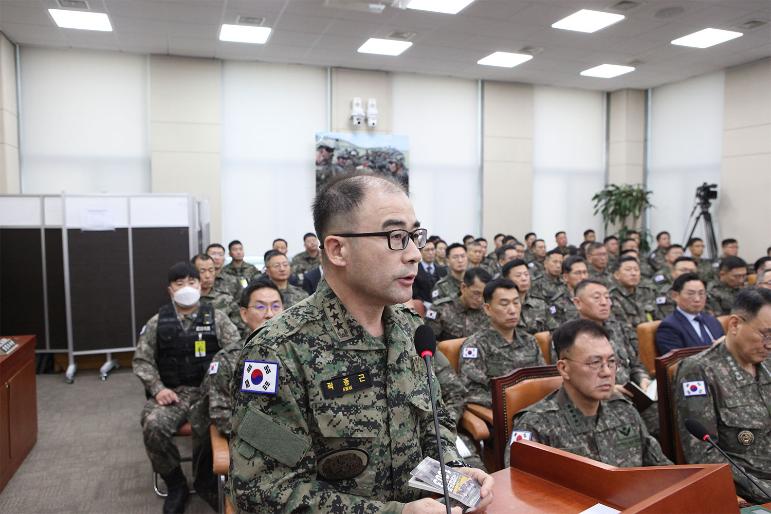 정보사여단 참모장이 신원유출 방지를 위해 가림막 뒤에서 질의 답변 중인 모습(사진=위즈경제)
