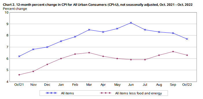 미국 노동 통계국에 따르면, 10월의 CPI는 전년 같은 달에 비해 7.7% 증가한 것으로 나타났습니다. 지난달에 비해선 0.4%가량 올랐는데요. 이 소식은 경제에 활력을 불어넣었습니다.