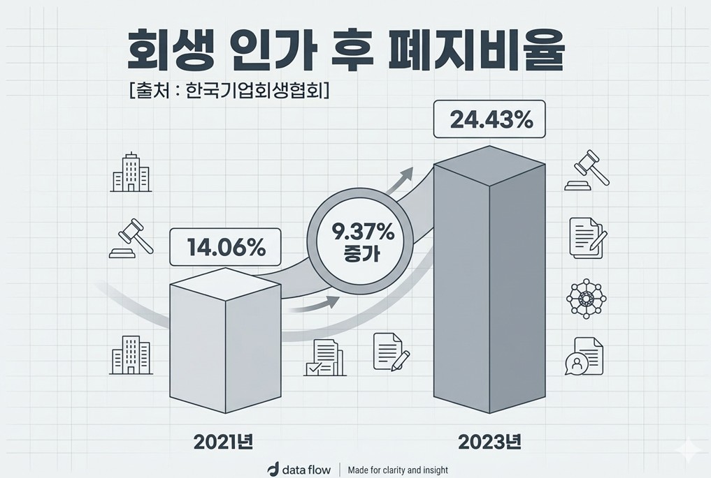 한국기업회생협회가 대법원 사법통계(2020~2023년)를 정리한 자료에 따르면, 인가 후 폐지 비율은 2023년 24.43%를 기록했다. 회생 인가를 받은 4곳 중 1곳이 법원으로부터 회생폐지 수순을 밟고 있는 것이다. 최근 통계(2024~2025년)는 공개되지 않았지만 민간 연구기관을 중심으로 폐지된 기업 수가 늘었을 거란 전망이 나오고 있는 만큼 해당 비율은 더 상승했을 것으로 보인다.