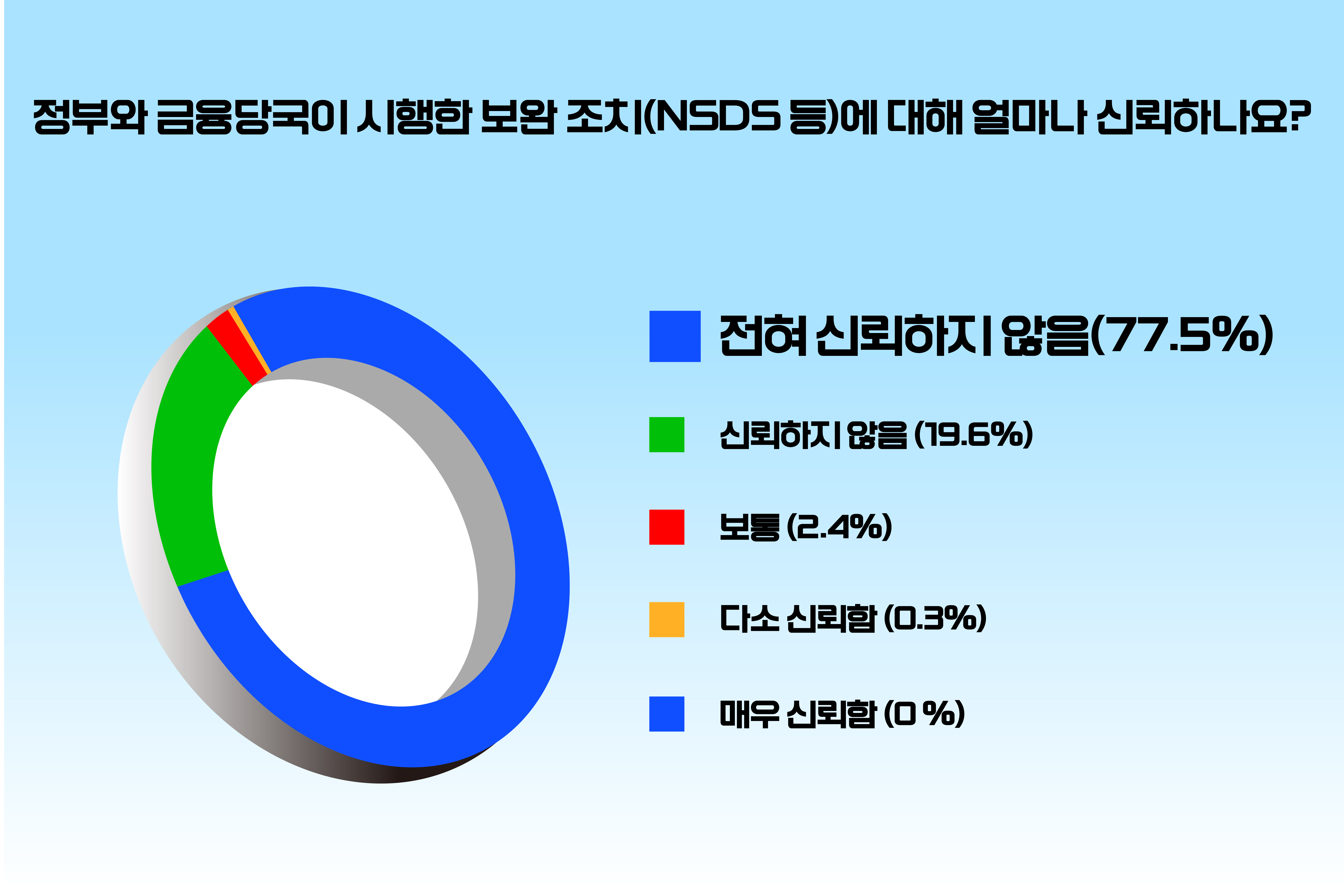 ‘정부와 금융당국이 시행한 보완 조치(NSDS 등)에 대해 얼마나 신뢰하나”라는 질문에 77.5%가 ‘전혀