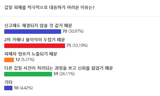 '갑질 피해를 적극적으로 대응하기 어려운 이유는'이라는 질문에는 '2차 가해나 불이익이 두렵기 때문',과 '신고해도 해결되지 않을 것 같기 때문'이라는 응답이 각각 33.19%, 30.97%를 차지했다. 이어 '다른 갑질 사건이 처리되는 과정을 보고 신뢰를 잃었기 때문'(26.11%), '피해자 정보가 노출되기 때문'(5.31%),'기타'(4.42%) 순이다. 기타의견으로는 '주변사람들 눈치가 보인다', '대응방법을 잘 모르겠다' 등이 나왔다.