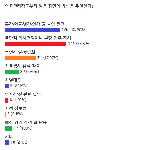 '학교관리자로부터 받은 갑질의 유형은 무엇인가'라는 질문에는 '독단적 의사결정이나 부당업무 지시'가 33.89%를 차지했고 '휴가·외출·병가·연가 등 승인 관련'은 30.29%로 집계됐다.이어 '폭언·막말·뒷담화'(17.07%), '친목행사 참석 강요'(7.69%), '예산 관련 간섭 및 남용'(4.09%), '차별대우'(2.16%), '인사·승진 관련 압박'(1.92%), '사적 심부름'(0.48%), '기타'(2.4%) 순이다. 기타의견을 살펴보면, '외부 연수 참여 강요', '교권보호위원회 개최 방해', '학부모 민원 무마를 위한 사과 요구' 등이 나왔다.