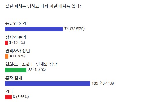 '갑질 피해를 당하고 나서 어떤 대처를 했나'라는 질문에는 '혼자 감내'(48.44%)한다는 응답이 절반에 가까웠다. 이어 '동료와 논의'(32.89%), '협회·노동조합 등 단체와 상담'(12.0%), '기타'(3.56%), '관리자와 상담'(1.78%), '상사와 논의'(1.33%) 순이다. 기타 의견에는 '교육청 갑질신고 활용', '도움 없이 홀로 대처' 등이 제기됐다.