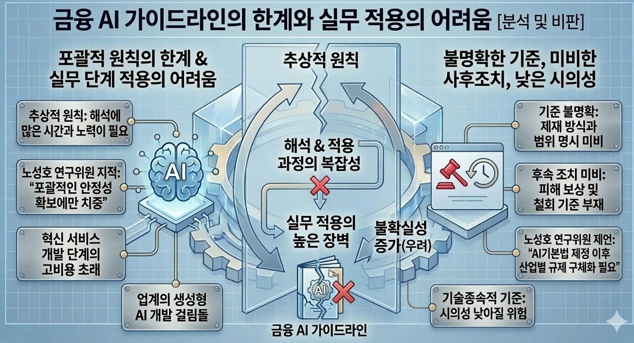 관련 기준이 불명확한 점도 문제다. 현 가이드라인은 기준 위반시 제재 방식과 범위가 명시되지 않은 경우가 대부분이다. 특히 금융기관이 가이드라인을 위반하는 AI 서비스를 개발했거나 이미 적용한 경우, 이를 철회하고 발생한 피해를 보상받는 후속조치가 미비하다. 노 연구위원은 이에 대해 "AI기본법 제정 이후 산업별 규제 및 감독기준을 구체화하는 과정이 필요하다"고 주장했다.