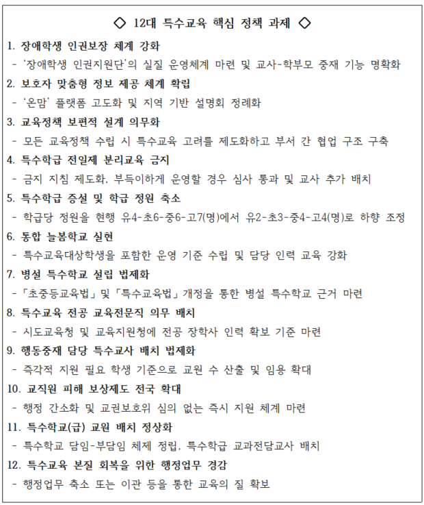 전국특수교사노동조합이 제시한 '12대 특수교육 핵심 정책 과제'