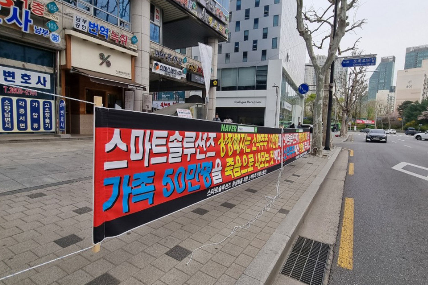 서울남부지방법원 앞에 게시된 스마트솔루션즈 현수막(사진=스마트솔루션즈 주주연대)