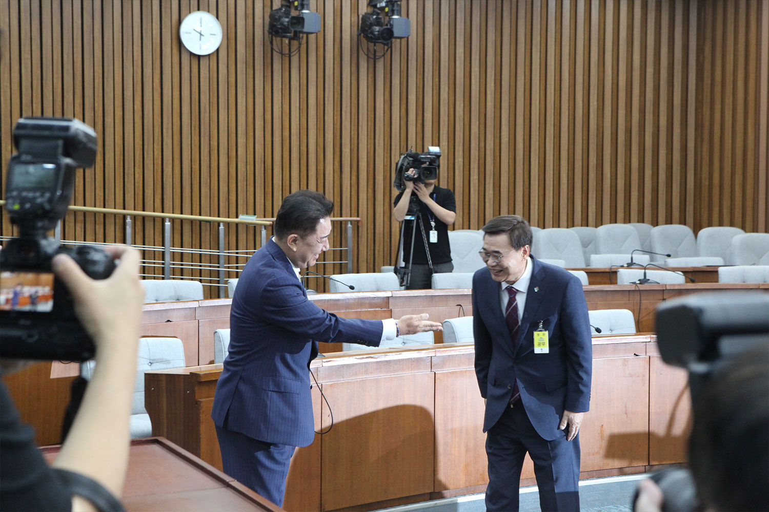 김병기 더불어민주당 대표 직무대행 겸 원내대표와 인사를 나누고 있는 이종석 국가정보원장 후보자(사진=위즈경제)