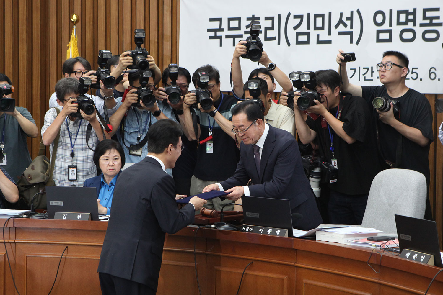 이종배 총리 후보자 인사청문특별위원회 위원장에게 선서문을 제출하는 김민석 국무총리 후보자(사진=위즈경제)