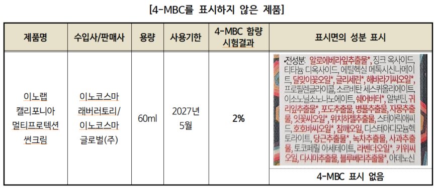 또한, 조사대상 중 4개 제품에서 자외선 차단 성분인 4-메칠벤질리덴캠퍼(4-MBC)가 검출됐다. 이들 제품은 국내 기준인 4% 이하를 준수했지만, 1개 제품은 해당 성분을 전혀 표기하지 않아 개선이 요구됐다. 4-MBC는 체내 흡수 시 내분비계 교란 가능성으로 유럽연합(EU)에서는 2026년부터 사용이 금지될 예정이다.