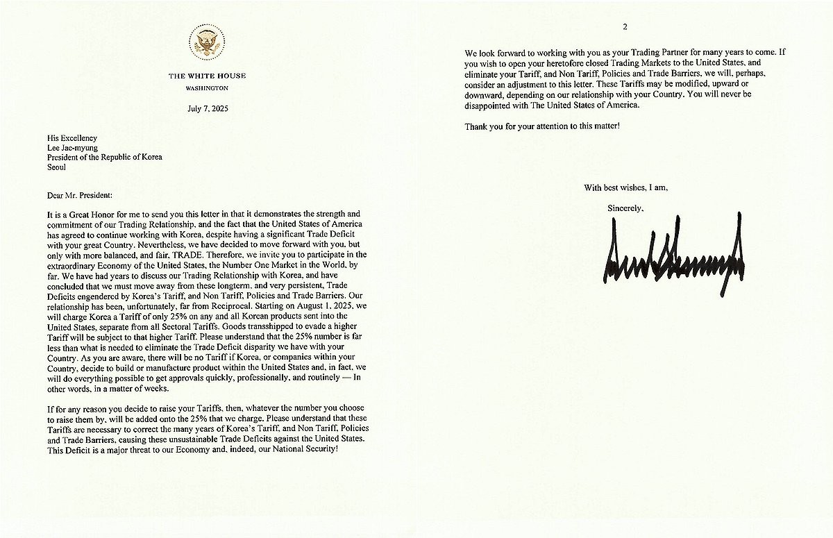 해당 서한에는 오는 8월 1일부터 한국산 제품에 25% 관세를 부과하겠다는 내용과 함께, 제3국을 경유한 환적 상품에도 동일한 관세를 적용하겠다는 방침이