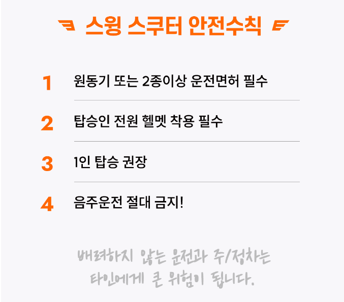 스윙 측은 이용자 안전을 위해 운전면허 인증을 거쳐야함 스쿠터의 시동을 걸 수 있고, 최대 속도를 40km/h로 제한하며, 헬멧을 기본적으로 제공하는 등 사고 방지에 최선을 다한다는 입장입니다만, 해결해야 하는 문제는 여전히 많습니다.