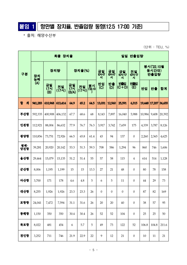 전국 12개 주요 항만의 5일 컨테이너 반출입량은 크게 회복한 모습을 보였습니다. 지난주 월요일(11월 28일) 대비 반출입량의 204% 수준으로 나타났는데요.