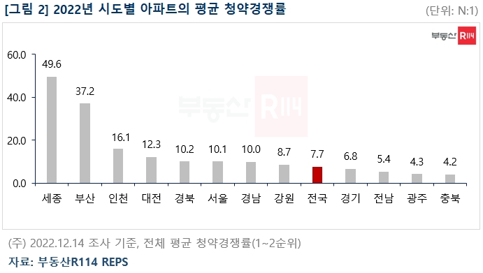 지난해 전국의 아파트 평균 청약경쟁률은 7.7대 1로 2021년(19.8대 1)과 비교해, 절반에도 못 미치는 수준을 나타냈습니다.