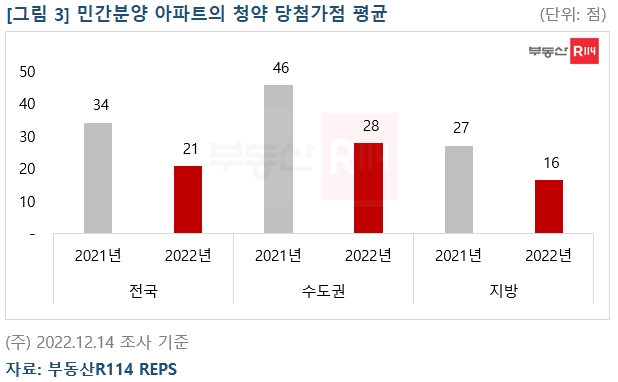 당첨자들의 가점 평균도 크게 낮아졌다. 2022년 1월부터 12월 14일까지 집계된 전국의 민간분양 아파트의 당첨가점 평균은 2021년 34점에 비해 13점 하락한 21점으로 조사됐습니다.