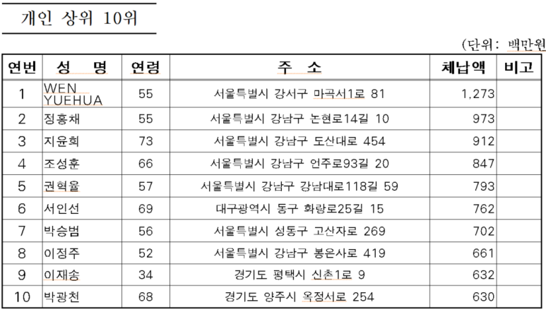 가장 많은 세금을 체납한 사람은 서울시 강서구에 거주하고 있는 ‘Wen