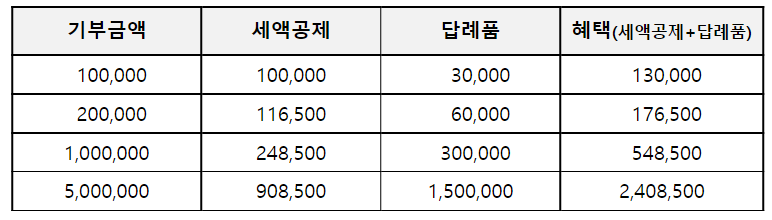 ▷ 10만원까지 전액 세액 공제에 금액의 30%에 해당하는 답례품 제공