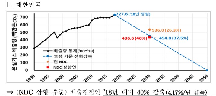 탄중위가 발표한 2020 국가 온실가스 감축목표(NDC)에 따라 우리나라는 온실가스 배출량을 매년 4.17% 감소해야
