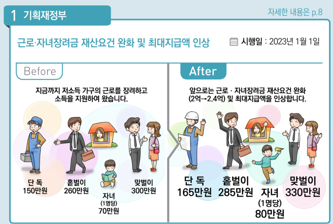 202311일부터는 근로/자녀 장려금의 재산요건이 확대되고 최대지급액이 인상됩니다. 재산요건은 2억 원에서 2.4억 원으로 늘어나며, 최대지급액 역시 10% 수준으로 증가합니다.