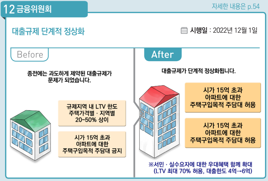 202212월부터는 이 규제들이 모두 크게 완화되었습니다. 규제지역 내 LTV 한도는 50%로 상향 단일화되며, 15억 원이 넘는 아파트에 대해서도 주택담보대출을 받을 수 있습니다. , 서민이나 실수요자에 대한 대출한도도 기존 4억에서 6억으로 늘어납니다.