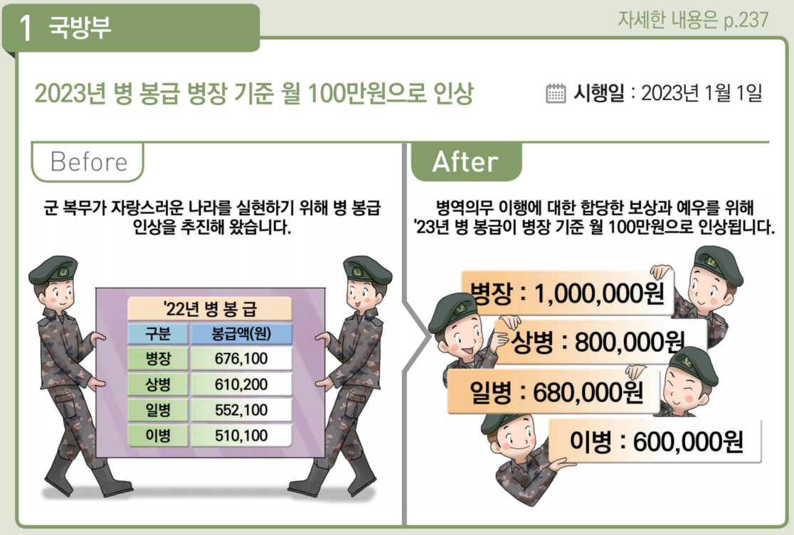 윤 정부의 대표적인 공약 중 하나였던 병사 봉급 인상 2023년에 이루어집니다. 이병의 경우 신년부터는 월급 60만 원을, 병장은 100만 원을 받을 수 있는데요. 인상률은 병장이 47.9%로 가장 높습니다.