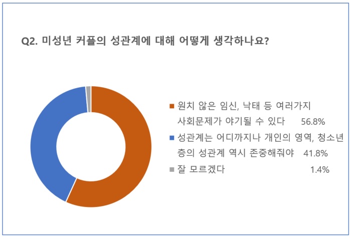 반면, ‘성관계는 어디까지나 개인의 영역이므로, 청소년층의 성관계 역시 존중해줘야 한다’는 참여자는 41.8%로 나타났는데요. ‘잘 모르겠다’는 참여자는 전체의 1.4%에 그쳤습니다.