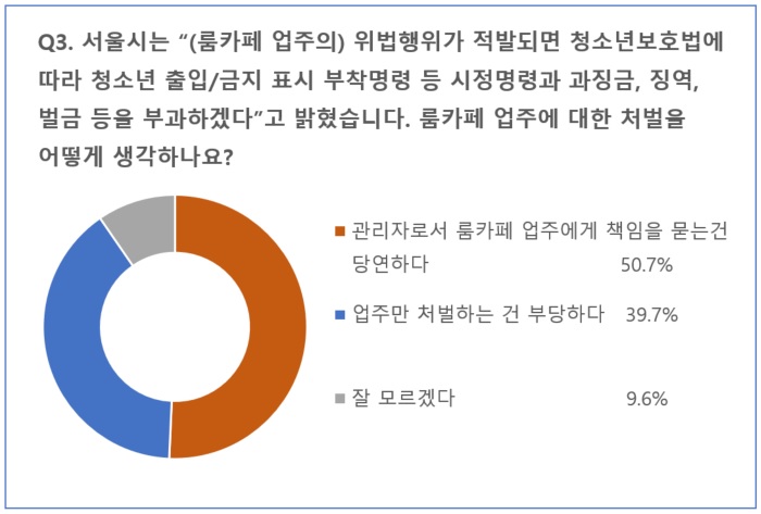 마지막으로 ‘서울시는 “(룸카페 업주의) 위법행위가 적발되면 청소년보호법에 따라 청소년 출입/금지 표시 부착 명령 등 시정명령과 과징금, 징역, 벌금 등을 부과하겠다”고 밝혔습니다. 룸카페 업주에 대한 처벌을 어떻게 생각하나요?’란 질문에 참여자의 절반 가량(50.7%)가 ‘관리자로서 룸카페 업주에게 책임을 묻는 건 당연하다고 생각한다’고 이야기했습니다.