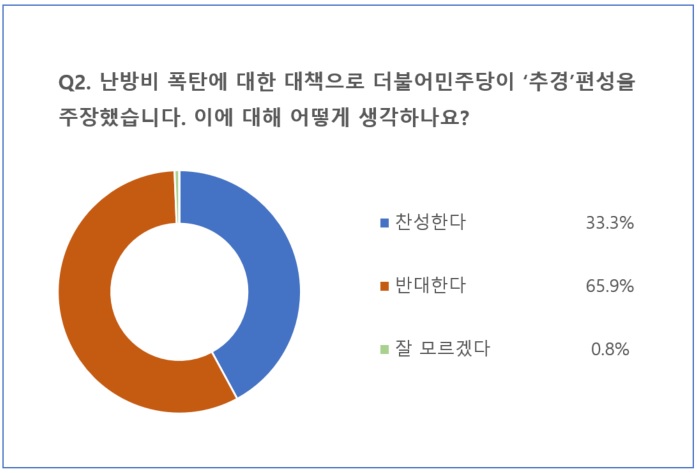 반면 33.3%는 추경을 ‘찬성한다’고 답했습니다. 이는 겨울철 난방비 등이 크게 올라 서민경제가 악화됐지만 정부가 기존 예산만으로 내놓은 대책은 한계가 있다는 생각이 영향을 끼친 것으로 분석됩니다. ‘잘모르겠다’는 응답은 0.8%를 차지했습니다.