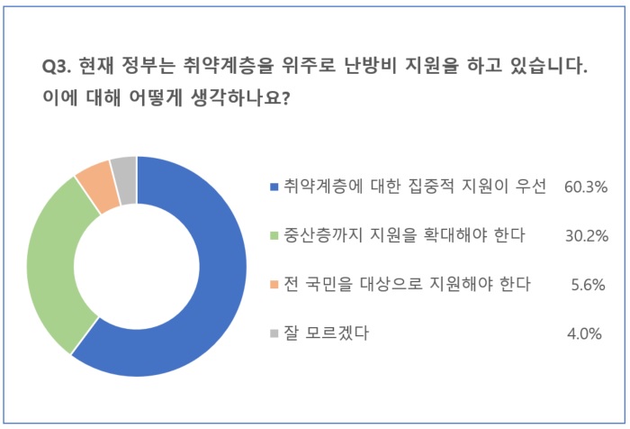 마지막으로 ‘현재 정부는 취약계층을 위주로 난방비 지원을 하고 있습니다. 이에 대해 어떻게 생각하나요?’라는 질문에는10명 중 6명(60.3%)이
