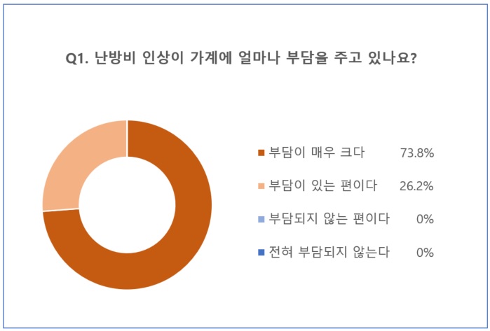 먼저 ‘난방비 인상이 가계에 얼마나 부담을 주고 있나요?’라는 질문에 ‘부담이 매우 크다’고 응답한 참여자가 73.8%로 가장 많았습니다. 또한 ‘부담이 있는 편이다’는 26.2%로 집계됐습니다. 이 응답을 합치면 100%로 사실상 전체 참여자가 모두 난방비 인상에 부담을 갖고 있음을 알 수 있었습니다.
