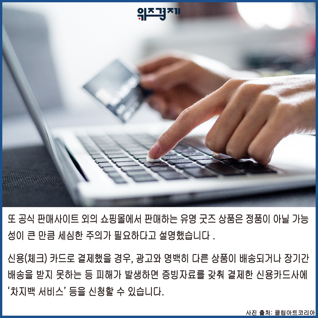 또 공식 판매사이트 외의 쇼핑몰에서 판매하는 유명 굿즈 상품은 정품이 아닐 가능성이 큰 만큼 세심한 주의가 필요하다고